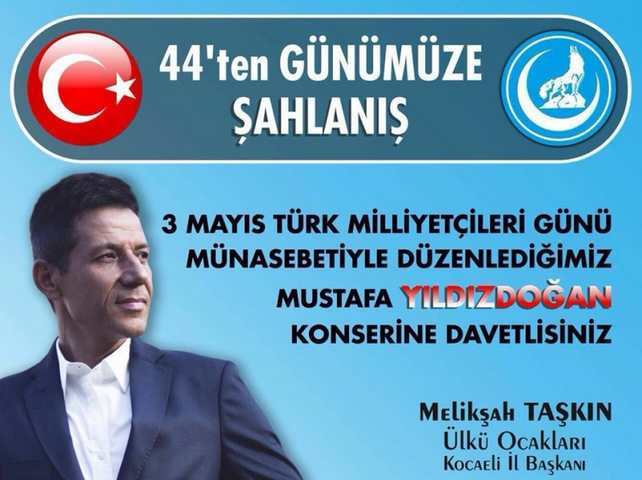 Kocaeli Ülkü Ocağı Başkanlığı 3 mayıs Türk Milliyetçileri günü münasebeti ile muhteşem bir konser düzenliyor. Ünlü sanatçı Mustafa Yıldızdoğan'ın sahne alacağı konser için İzmit Anıt Park düşünüldü.