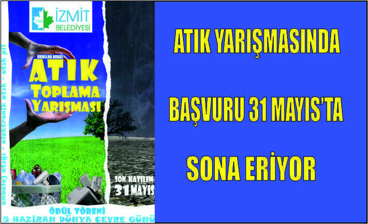 Eylül ayında başlayan ve 31 Mayıs’ta sona erecek olan okullar arası ambalaj atığı, atık pil ve elektronik atık dallarındaki yarışmada dereceye girecek 3 okula çeşitli ödüller verilecek. Yarışma için başvuruların alınmaya devam ettiğini söyleyen İzmit Belediyesi yetkilileri,” her dalda en çok atık toplayıp dereceye girecek okullara ödülleri 5 Haziran Dünya Çevre Günü’nde verilecek” dediler. Yarışmaya okulların ilgisinin oldukça yüksek olduğu kaydedildi.