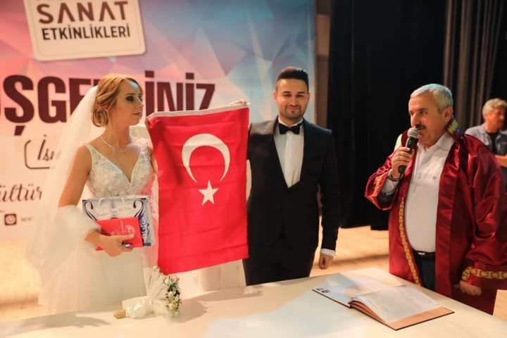 imzalarınız gibi ömürlük olsun” ifadelerini kullandı. Evlenen çiftlere Türk Bayrağı ve Kur’an-ı