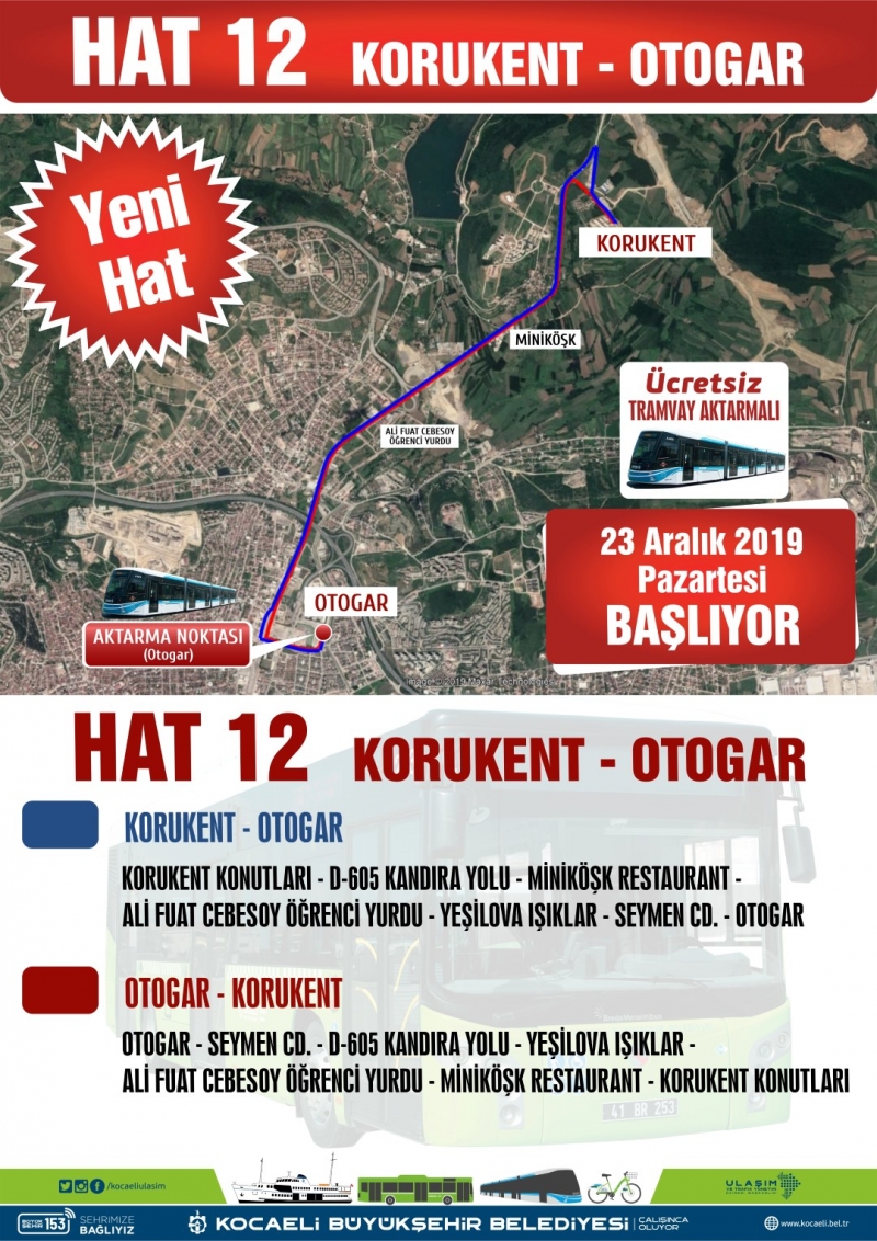 İzmit ilçesi Çayırköy mevkiinde bulunan Korukent Konutları ve yöresine hizmet vermek için kurulan Hat 12 Korukent-Otogar hattı seferlerine Pazartesi günü başlayacak. Yeni 12 No’lu hat ile Korukent’ten Otagar’a gelişlerde Tramvay aktarması ücretsiz olacak. Tramvay kullanılarak Otogara gelişlerde ise 12 No’lu Korukent otobüslerinde tamamlayıcı ücret geçerli olacak.