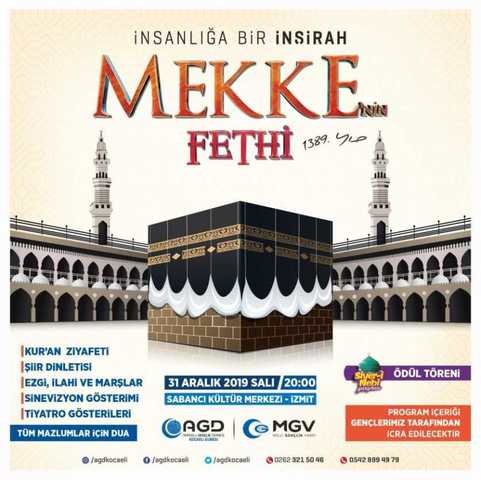 31 Aralık 2019 Salı akşamı 19:30’da tüm halkımızı çocukları ile birlikte kendilerine en yakın noktada Anadolu Gençlik Derneği tarafından düzenlenen Mekke’nin Fethi Programlarına davet ediyoruz.