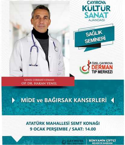 9 Ocak Perşembe günü saat 14.00’da Atatürk Mahallesi Şehit Yarbay İlker Çelikcan Semt Konağı’nda, ilçede sağlık hizmeti veren Derman Tıp Merkezi ile ortaklaşa düzenlenecek seminerde Genel Cerrahi Uzmanı Op. Dr. Hakan Yenel katılımcıları bilgilendirecek. “Mide ve Bağırsak Kanserleri” konulu seminerde katılımcıların merak ettiği sorularda Yenel tarafından cevap bulacak.
