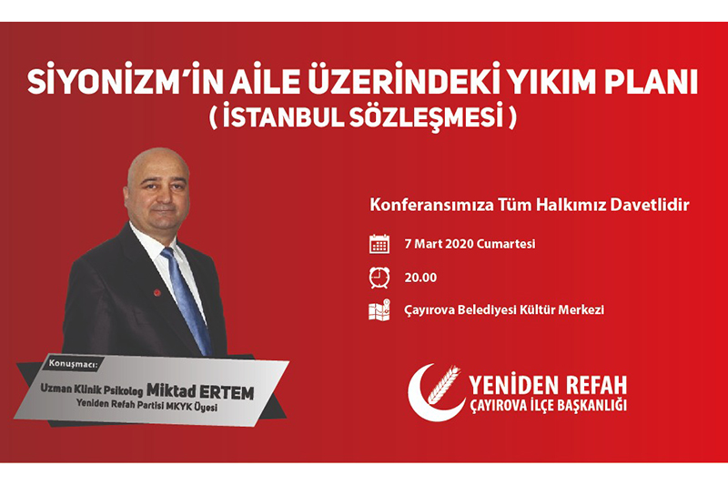 2011 yılında mevcut hükümet tarafından alelacele ve oldu bittiye getirilerek imzalanan İstanbul sözleşmesi denilen bu gayri ahlaki sözleşme ile toplumumuzda yaratılmak istenen infial düzenleyeceğimiz konferans ile halkımıza anlatılacaktır.