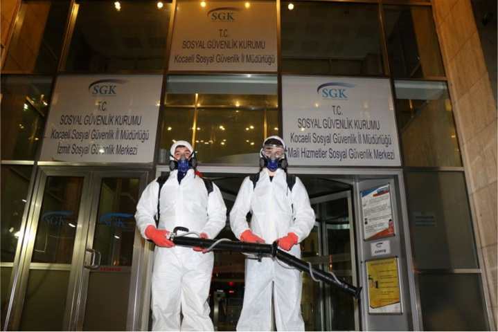 Çin’in Vuhan şehrinde ortaya çıkan ve tüm dünyada büyük paniğe neden olan koronavirüsden (Covid-19) dolayı Kocaeli Büyükşehir Belediyesi ekipleri, sokak, cadde ve kalabalığın yoğun olduğu bölgelerde dezenfekte işlemlerine tüm hızıyla devam ediyor. Bu kapsamda Sağlık ve Sosyal Hizmetler Daire Başkanlığı’na bağlı 50 kişilik ekip, 11 araçla kamu, kurum ve kuruluş binaları ile bahçelerini ve vatandaşların yoğun olarak kullandığı alanları dezenfekte etti. Dezenfeksiyon işlemi sürekli olarak ekiplerce devam ettiriliyor.