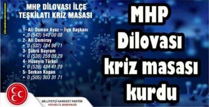 Ayaz, Bu itibarla Devletimiz ve Genel Merkezimizden gelen talimatlarda üzerimize düşen herhangi bir görevi tam bir koordinasyon içerisinde yürütmek adına Milliyetçi Hareket Partisi Kocaeli İl Başkanlığımızın öncülüğünde MHP Dilovası İlçe Teşkilatı olarak Kriz Masası oluşturduk dedi.