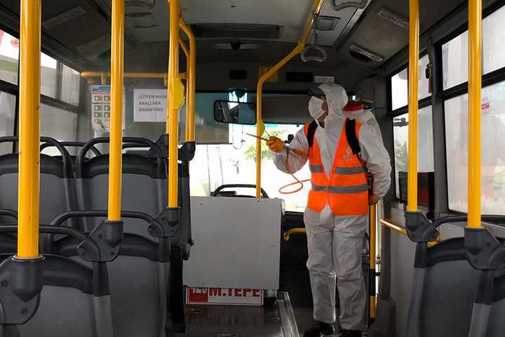 otobüslerini dezenfekte ederek, salgın hastalığın yayılmaması için çalışıyor.