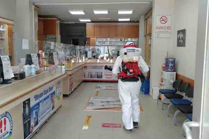 Virüs salgınının yayılmaması amacı ile sokağa çıkma yasağında muaf olan vatandaşların sağlığı için Kocaeli Büyükşehir Belediyesi tarafından açık olan işyerlerinde dezenfekte çalışması gerçekleştiriliyor. 10 ekip ve 30 personel tarafından yapılan çalışmalarda eczane ve diğer açık işyerleri dezenfekte ediliyor. Dezenfeksiyon Koordinasyon Merkezi personelleri ayrıca durak, üst geçit, köprü, yürüyüş yolu ve vatandaşların kullandığı diğer alanlarda itina ile dezenfekte uygulaması gerçekleştiriyor. Büyükşehir ekipleri dezenfekte uygulamalarına virüs ile mücadele bitene kadar devam edecek.
