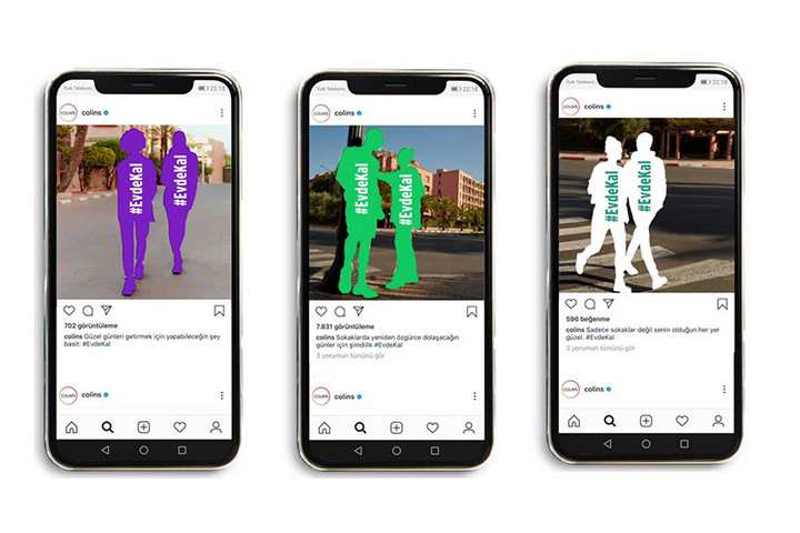 Genç ve kendini genç hissedenlerin moda markası COLIN’S, sosyal medya hesabındaki sokak kombinlerini yok ediyor. Fabrikalarını koruyucu maske üretimi için çalıştıran COLIN’S, sosyal medyada sokak kombinleri yerine sadece insan siluetleri paylaşarak “Evde Kal” mesajı veriyor.