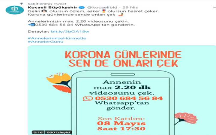 Dünyaca içinde bulunduğumuz Koronavirüs(Covid-19) salgın hastalığı dolayısıyla bu Anneler Günü’nde evlerimizde olacağız. Kocaeli Büyükşehir Belediyesi de insanın hayatı boyunca her zaman yanında olan kıymetli anneler için “Her Şeyi Anneler Çeker. Korona Günlerinde Siz de Annenizi Çekin” adlı yarışma düzenliyor. Covid-19 dolayısıyla evde kaldığımız süreler kitap okumak spor yapmak gibi aktivitelerimizin yanında kendi filmimizin(etkinlik videosu) yönetmeni de olabiliriz. Etkinlik videosunu yaparken de tek istenen başrol oyuncularının annelerimizin olması. Tabiki her yarışma gibi bu yarışmanın da zaman kuralı var. Kültür ve Sosyal İşler Daire Başkanlığı tarafından yürütülen yarışmaya gönderilecek videonuzun azami süresi 2 dakika 20 sanayi olmalı.