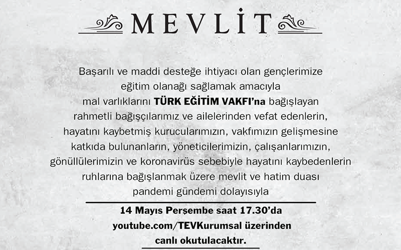 Türk Eğitim Vakfı, en kısa zamanda bu salgın hastalıktan kurtulmamız, sağlıklı günlere kavuşmamız ve umutlu yarınlar niyetleriyle okunacak Mevlide herkesi davet ediyor.