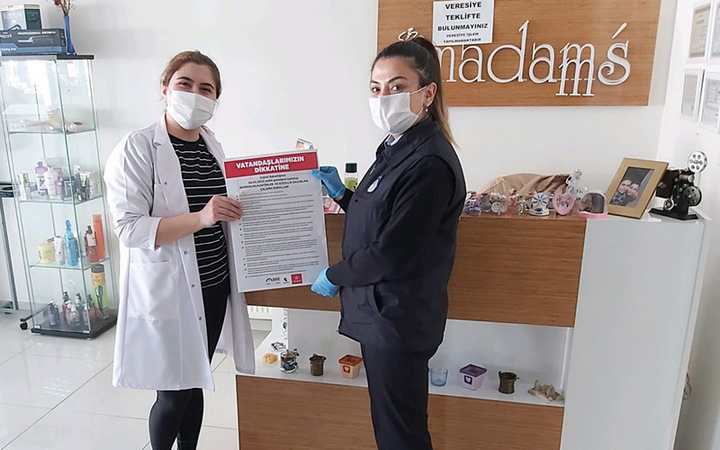 Kovid 19 virüs salgınıyla mücadele kapsamında alınan kararla mart ayında faaliyetlerine ara veren berber, kuaför ve güzellik salonları, yayınlanan genelgeyle kapılarını 11 mayısta açmıştı. Genelgeyle çalışma yönergeleri yeniden belirlenen ilçede faaliyet gösteren berber, kuaför ve güzellik salonlarını ziyaret eden zabıta ekipleri, uyulması gereken kuralları hatırlatarak uyarıcı broşürleri işletmecilere teslim ediyor.