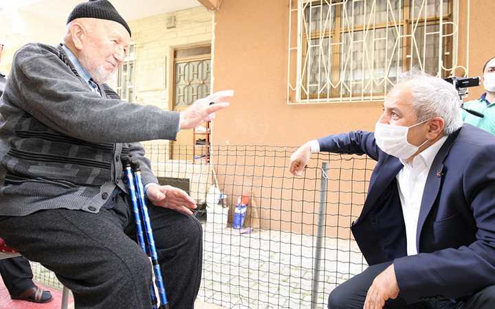Virüs salgınıyla mücadele kapsamında hastalıktan korunmaları amacıyla sokağa çıkma kısıtlaması getirilen çocuklar ve 65 yaş üstü vatandaşları evlerinde ziyaret eden Başkan Büyükgöz, 95 yaşındaki Yakup Güler’i evinde ziyaret ederek halini hatırını sordu, hayır duasını aldı