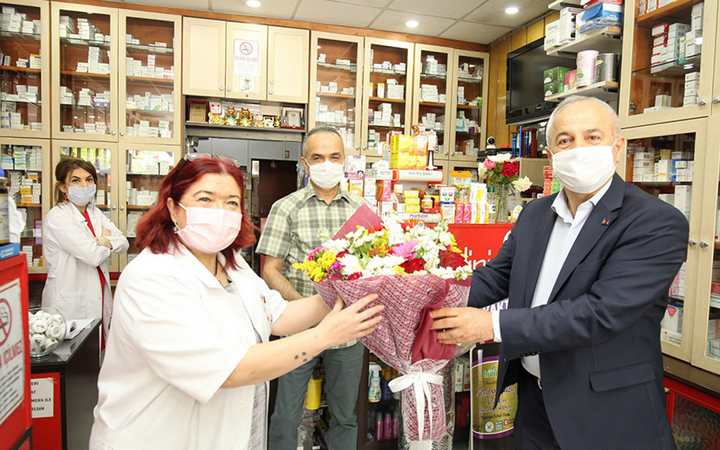 Gebze Belediye Başkanı Zinnur Büyükgöz’den eczacılara tebrik ziyaretleri. Eczacılar Günü vesilesiyle ilçede hizmet veren eczaneleri ziyaret eden Başkan Büyükgöz, eczacılar ve görevli çalışanlarla sohbet etti. Kovid 19 virüs salgınıyla ülkece, devlet millet el ele vererek mücadele edildiğini belirten Başkan Büyükgöz, “Virüs musibetini kısa sürede alt edeceğiz inşallah. Bu savaşta ön cephede savaşan sağlık camiamızın önemli bir parçasını teşkil eden eczacılarımız da vatandaşlarımızın ilaç taleplerini en iyi şekilde yerine getiriyor. Eczacılarımıza ve görevli tüm personellerine bu zor mücadelede kolaylıklar ve başarılar diliyorum. Tüm eczacılarımızın Eczacılar Günü kutlu olsun” dedi. Başkan Büyükgöz’ün ziyaretlerinden duyduğu memnuniyeti ifade eden eczacılar teşekkür etti.