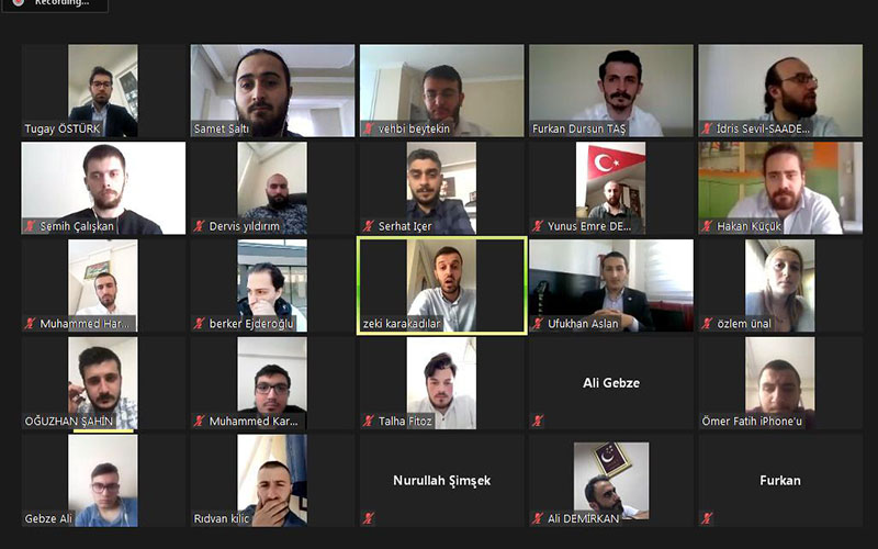 Ev sahipiliğini Genç Saadet Kocaeli adına İl Gençlik Kolları Başkanı Furkan Dursun Taş’ın yaptığı Zoom uygulaması üzerinden düzenlenen Bayramlaşma programına CHP İl Gençlik Kolları Başkanı Zeki Karakadılar , İYİ PARTİ İl Gençlik Kolları Başkanı Tugay Östürk , HÜDA PAR İl Gençlik Kolları Başkanı Muhammed Harun Vergili , Alperen Ocakları Başkanı Murat Ağçay ve parti mensupları katılım sağladı.