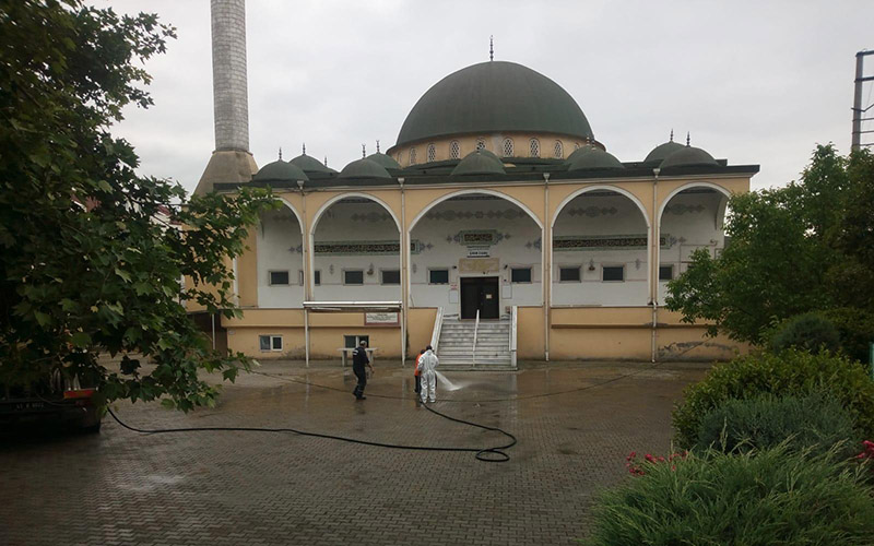 Körfez Belediyesi Temizlik İşleri Müdürlüğü ekipleri, daha önce cami içlerinde gerçekleştirilen hijyen çalışması sonrasında cuma namazının kılınacağı cami bahçelerini de dezenfekte etti. Sabunlu suyla cami içleri temizlenirken, oturma grupları ve yeşil alanlar da elden geçirildi.