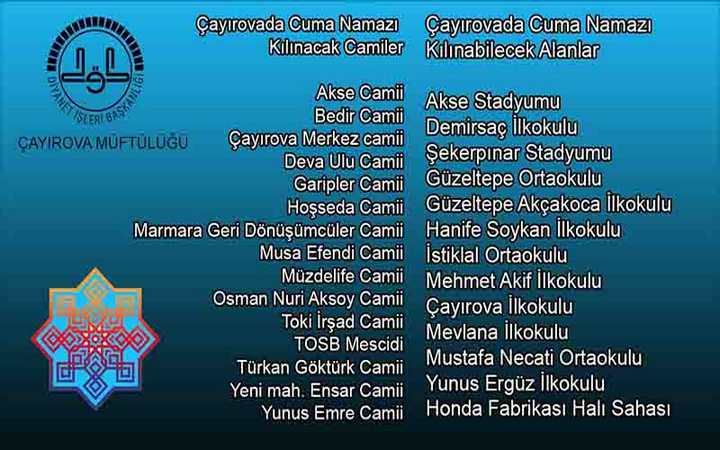 Çayırova ilçesinde Cuma namazı kılınacak alanlar Çayırova Kaymakamlığı tarafından açıklanadı. Çayırova kaymakamlığından yapılan açıklamada Cuma namazı kılınacak alanlar için ve alınacak tedbirler önlemler için açıklama yapıldı