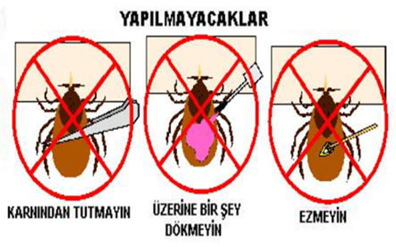 3. Eğer vücutta kene tespit edilirse en yakın sağlık kuruluşuna başvurularak kenenin derhal çıkarılması sağlanmalı. Kene ne kadar çabuk vücuttan uzaklaştırılırsa hastalığın bulaşma riski o kadar azalmaktadır. Çıplak elle asla müdahale edilmemeli, keneyi çıkarmak için vazelin, alkol, kolonya, sıcak kibrit, sigara basma gibi uygulamalar asla yapılmamalı.