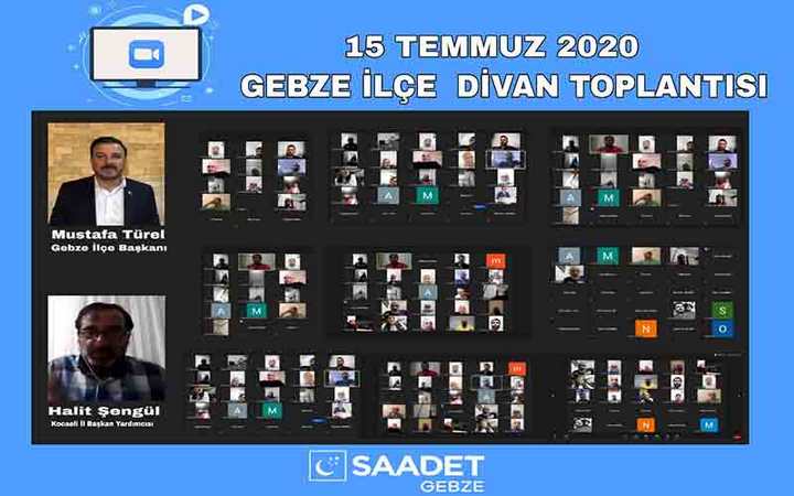 Ilçe Divan toplantısında Saadet Partisi Gebze ilçe teşkilatının 1 aylık çalışmalarını değerlendiren Mustafa Türel; yoğun bir Haziran ayı geçirdik teşkilatlanma açısından oldukça verimli bir ay oldu covid 19 salgından dolayı yavaşlatmış olduğumuz teşkilatlanma çalışmalarına Temmuz ayı itibariyle daha da hızlandırmış bulunmaktayız Önümüzdeki süreçte tüm mahallelerimizde ki teşkilatlanma çalışmalarını tamamlayacağız, ve seçim sandık çalışmalarını başlatacağız. İnşallah bundan sonraki süreç de Gebze de Saadet Partisi için Altın bir dönem başlayacak diyen Türel konuşmasın devamında bugün hain darbe girişiminin yıl dönümü bu vesileyle Milletimize bu kara geceyi yaşatanları, hain darbeye teşebbüs edenleri bir kez daha şiddetle kınıyor, o gece şehadet şerbeti içen kardeşlerimizi rahmetle, gazilerimizi minnetle anıyorum.