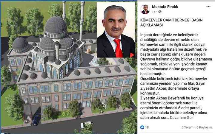 Kümeevler camii derneği başkanı Mustafa FINDIK sosyal medya hesabından yatığı paylaşımda, cami inşaatının Ziyaettin Akbaş döneminde başlayıp, ondan sonra durduğunu, şimdi Bünyamin Çiftçi ile birlikte temelinin atıldığını açıklayan paylaşım yaptı.