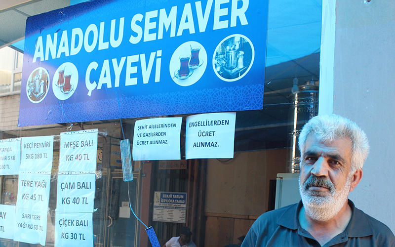Yaptığı çaylarla adeta kendi alanında marka olan Anadolu Semaver Çayevi'nin sahibi Zeki Bingöl, herkese örnek olabilecek bir hizmete imza attı. Şehit aile yakınlarına; gazilere ve Kitap okuyan öğrencilere çayı ücretsiz yaptı. Şehit ve gazilerin bu vatan için bedel ödediğini belirten Zeki Bingöl, 'Şehitlerimizin yakınlarına ve gazilerimize hizmet bizim bir borcumuzdur; bunlara sahip çıkmak zorundayız. Bu yüzden müessesemizde ki çaylar ücretsizdir' dedi.