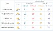 Kocaeli’de Pazartesi ve Salı günü az bulutlu bir hava beklenirken, hava sıcaklıkları ise 30 derece civarında olacak. Çarşamba günü 31 dereceye çıkacak olan hava sıcaklığı Perşembe günü 30 derece civarında seyredecek. Kent genelinde bu hafta yağmur beklenmiyor. Yetkililer, sıcak hava dolayısı ile yaşlı ve kronik rahatsızları bulunanların, mecbur kalmadıkça dışarıya çıkmalarının tehlikeli olacağı uyarısında bulundu.
