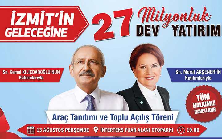 İzmit Belediyesi, kente kazandırdığı hizmet araçlarının tanıtımını, 1 yıl içerisinde gerçekleştirdiği projelerin toplu açılışını ve temel atma törenini CHP Genel Başkanı Kemal Kılıçdaroğlu ve İYİ Parti Genel Başkanı Meral Akşener’in katılımıyla gerçekleştirecek