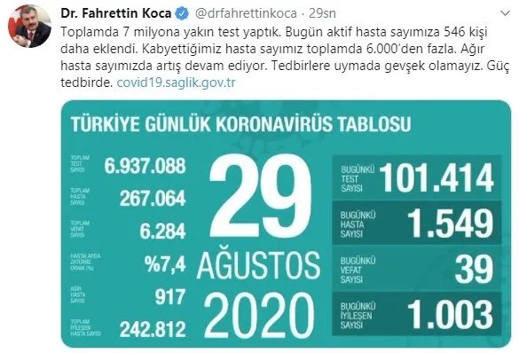 Resmi Twitter hesabından açıklama yapan Bakan Koca, önemli uyarılarda da bulundu. İşte 29 Ağustos'a ait koronavirüs vaka sayıları...