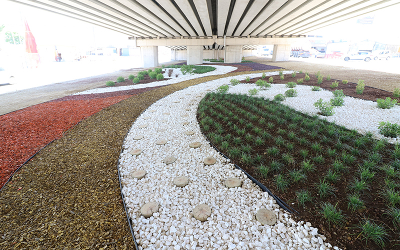 Çevre düzenlemesinin sona yaklaşıldığı köprülü kavşaktaki çalışmalar 6 bin 22 metrekare alanda gerçekleştiriliyor. Çalışma dahilinde kavşağa canlılık katacak farklı renklerde yonga ve taş kullanılıyor. Yapılan çalışma ile kavşak ve çevresi estetik acıdan zenginleşiyor.