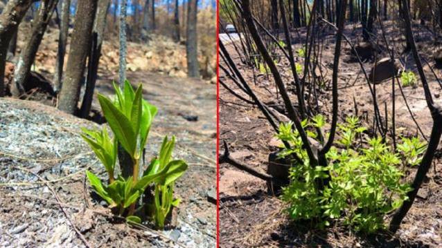 Yangınların üstünden yaklaşık 3 hafta geçtiğini belirten Dr. İlemin, "Hayıt, Sandal başta olmak üzere maki türleri tekrar toprak altından sürgün veriyor ve yeşeriyor" diyerek çektiği fotoğrafları paylaştı.