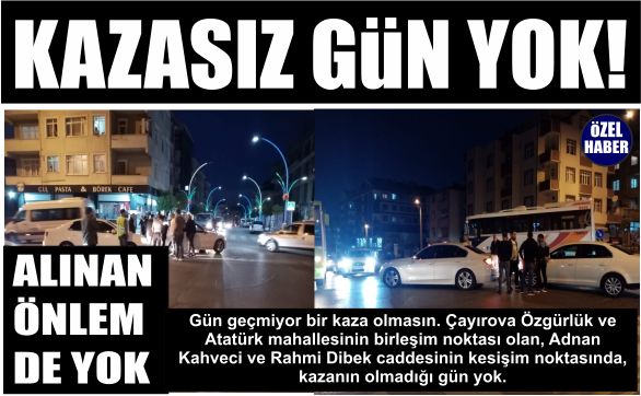 Gün geçmiyor bir kaza olmasın. Çayırova Özgürlük ve Atatürk mahallesinin birleşim noktası olan, Adnan Kahveci ve Rahmi Dibek caddesinin kesişim noktasında, kazanın olmadığı gün yok.