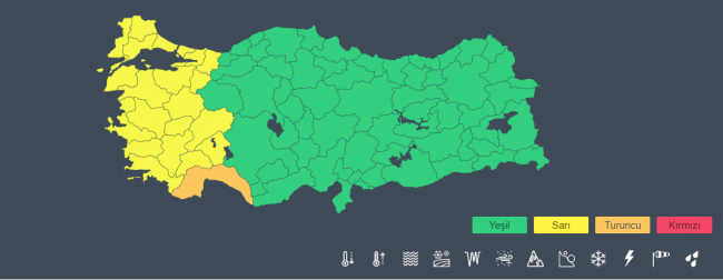 Turuncu kodla uyarılan kent için yetkililer de şu ifadeleri kullandı: "Sel, su baskını, yıldırım, ulaşımda aksamalar, yerel dolu yağışı, yağış anında kuvvetli rüzgar ve hortum gibi olumsuzluklara karşı dikkatli ve tedbirli olunmalıdır."