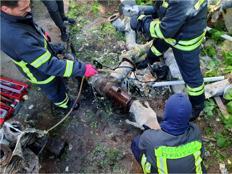 Köpeğin sıkıştığı demir boru hayvana zarar verilemeden taş motoru ile kesildi. Sıkıştığı yerden yara almadan kurtarılan köpek, sağlık kontrolü için veteriner ekiplerine teslim edildi.