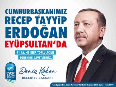 Cumhurbaşkanı Erdoğan, Eyüpsultan'da 41 eserin açılışına katılıyor Cumhurbaşkanı Recep Tayyip Erdoğan, Eyüpsultan’a değer katacak ve yaşam kalitesini artıracak 41 muhteşem eseri