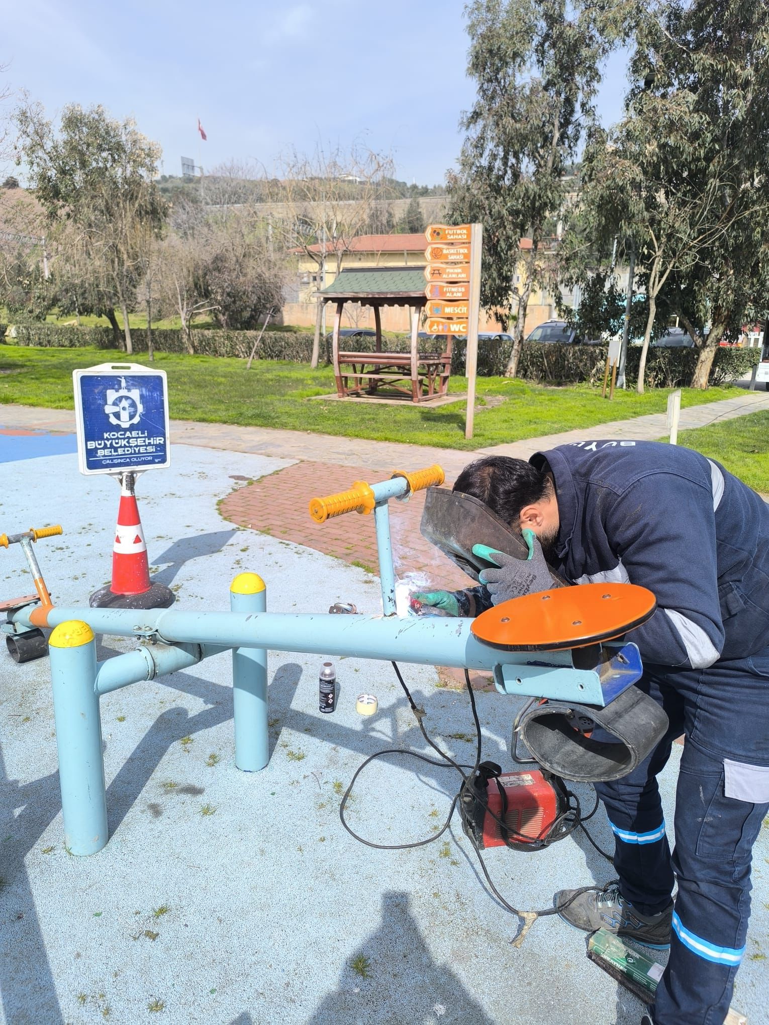 Kocaeli Büyükşehir Belediyesi, çocukların güvenli ortamlarda oyun oynayabilmesi ve vatandaşların parkları daha konforlu kullanabilmesi için kent genelindeki oyun ve spor alanlarında bakım çalışmalarını periyodik olarak sürdürüyor. Bu kapsamda yapılan kontrol çalışmalarının ardından oyun alanlarında temizlik, bakım ve onarım işlemleri de gerçekleştirildi. Yıpranan bölümler onarıldı, gerekli noktalarda boyama çalışmaları yapılarak parkların hem daha güvenli hem de daha estetik bir görünüme kavuşması sağlandı.